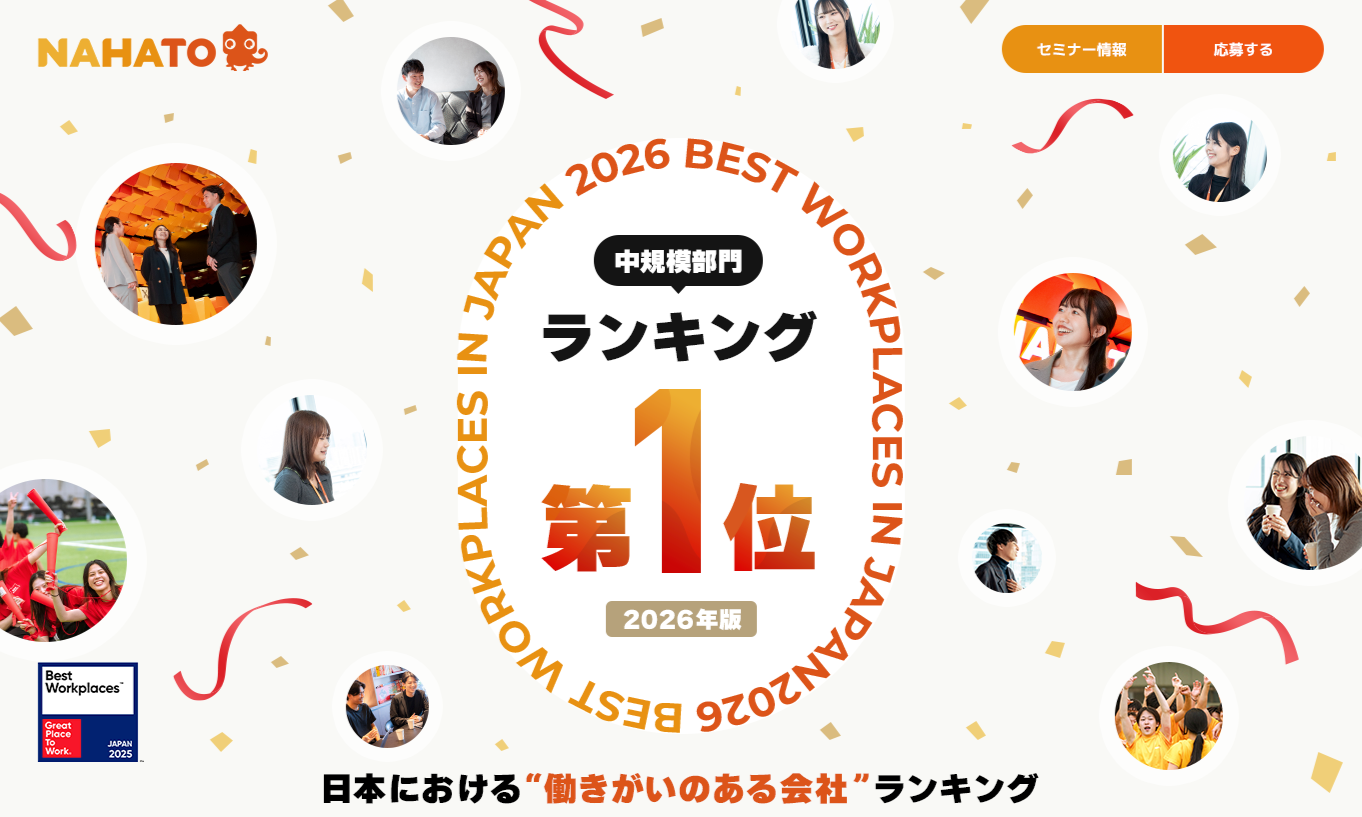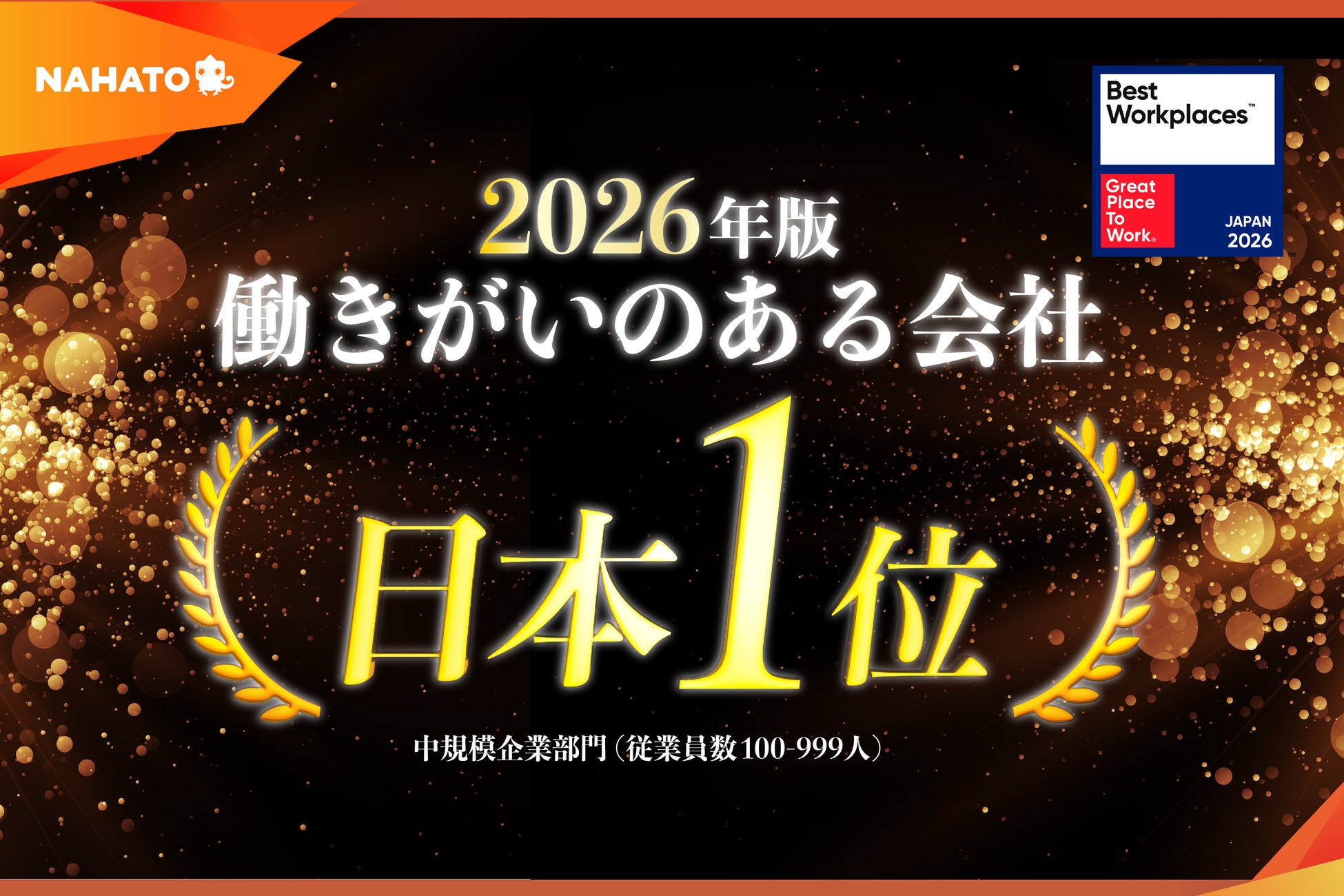 株式会社ナハト(本社:東京都渋谷区、代表取締役:安達友基、以下「ナハト」)は、Great Place To Work® Institute Japan(以下「GPTW Japan」)が発表した2026年版 日本における「働きがいのある会社」ランキングの中規模部門(従業員100-999人)において、国内第1位に選出されたことをお知らせいたします。昨年の第11位から大きく飛躍し、創業8期目で日本一の評価をいただくに至りました。