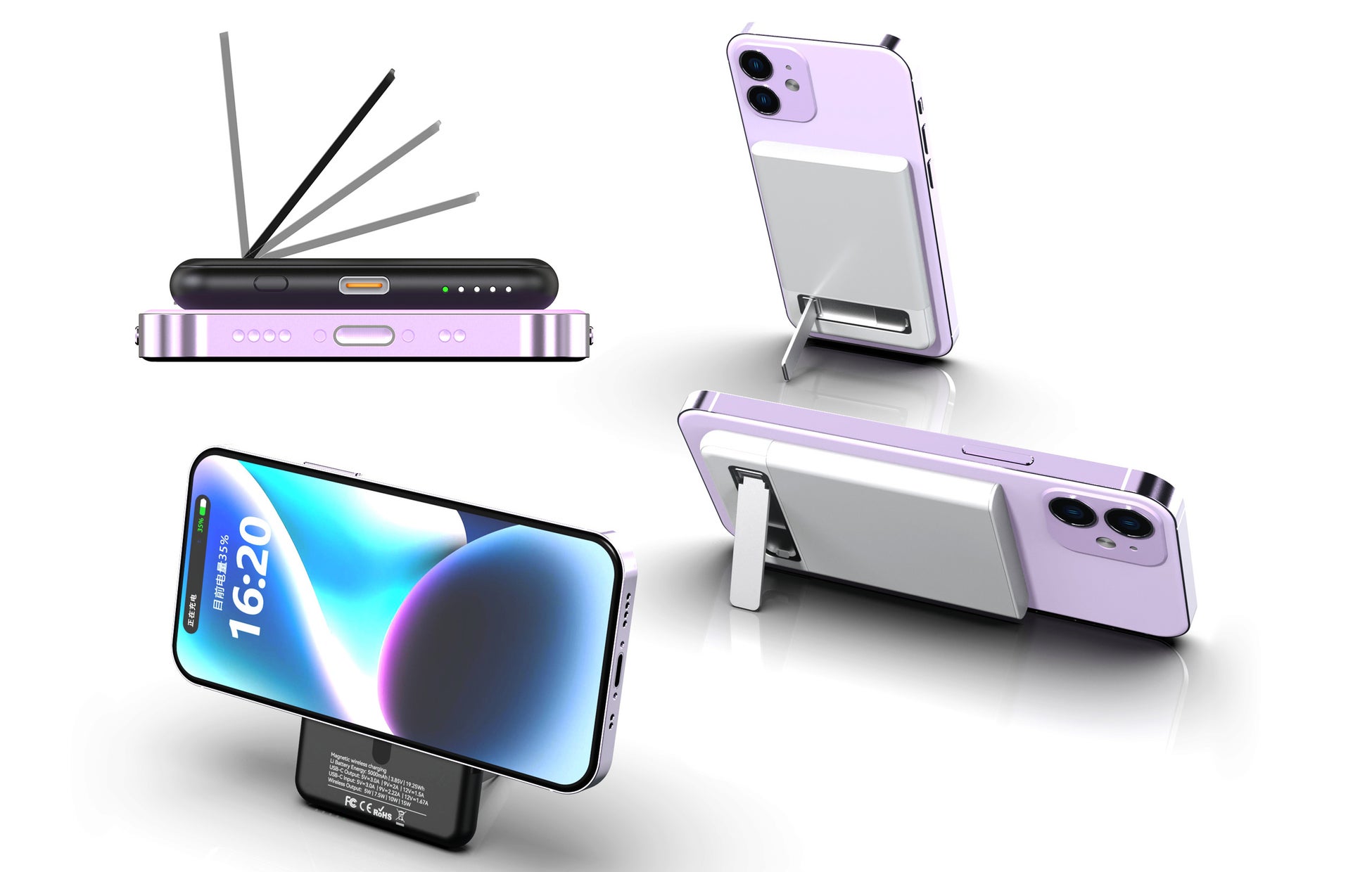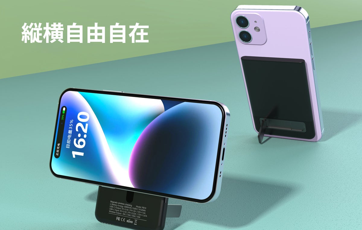 PB Slimはバッテリーの裏側に折り畳みプラグが付いており、ワンタッチでスタンドに早変わりします。縦置きや横置きが自由自在にできるため、ビデオ会議やライブ配信の視聴など、外出先でも便利に使えます。