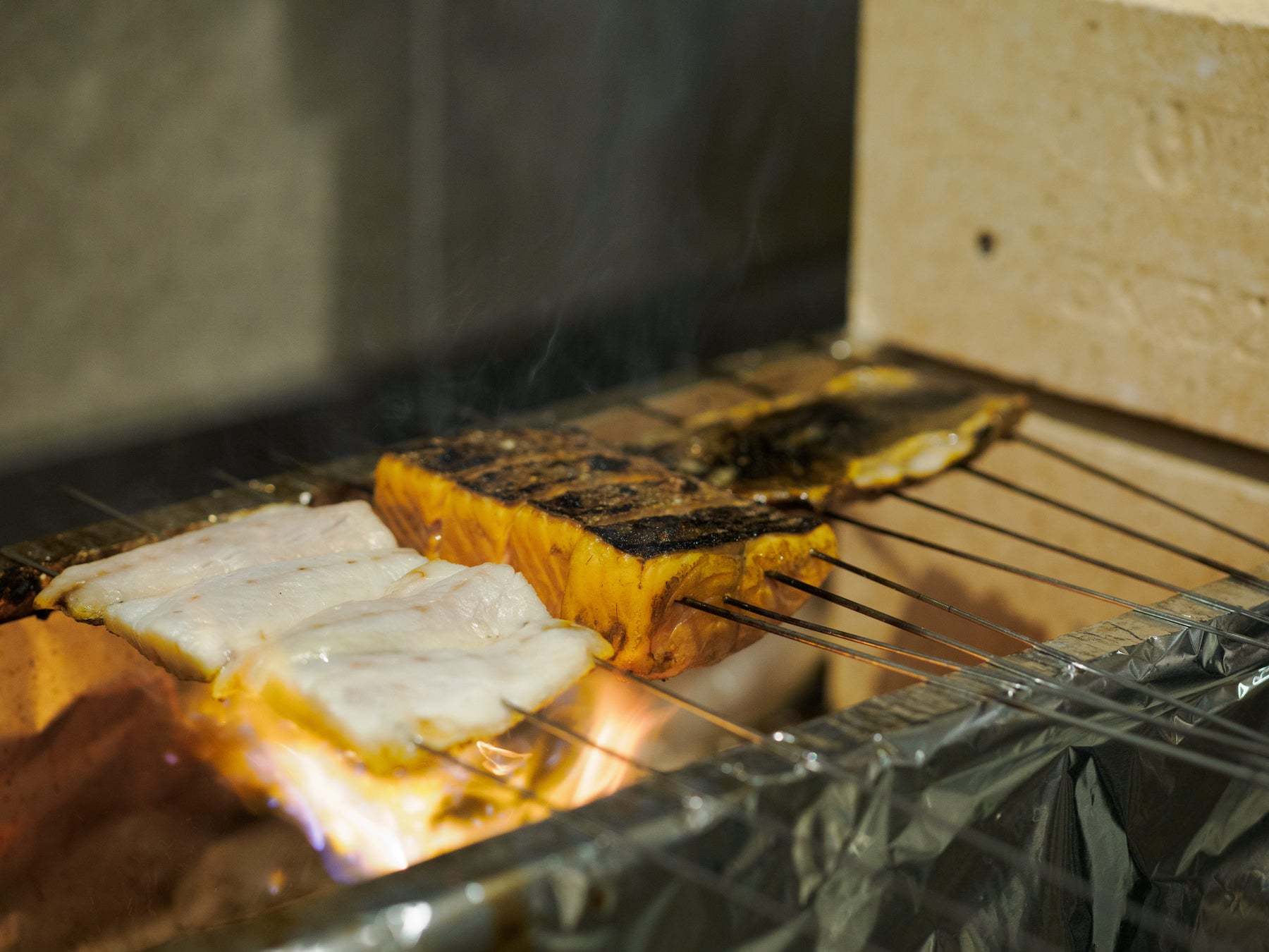 特に注目は、「UMITO 熱海 別邸」でお取引のある、静岡県焼津「サスエ前田魚店」のこだわりの干物を炭火で焼き上げる一皿。
