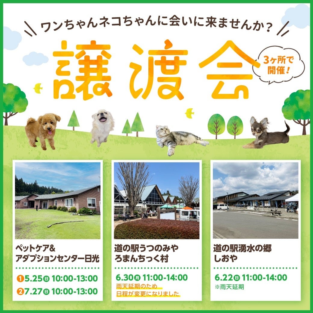 なお、2025年6月11日(水)道の駅うつのみや ろまんちっく村にて開催を予定しておりました出張譲渡会につきましては雨天延期となり、2025年6月30日(月)に同場所にて開催を予定しております。2025年7月27日(日)ペットケア&アダプションセンター日光での開催を予定しております、第8回譲渡会と合わせまして、皆様のご来場をスタッフ一同お待ちしております。
