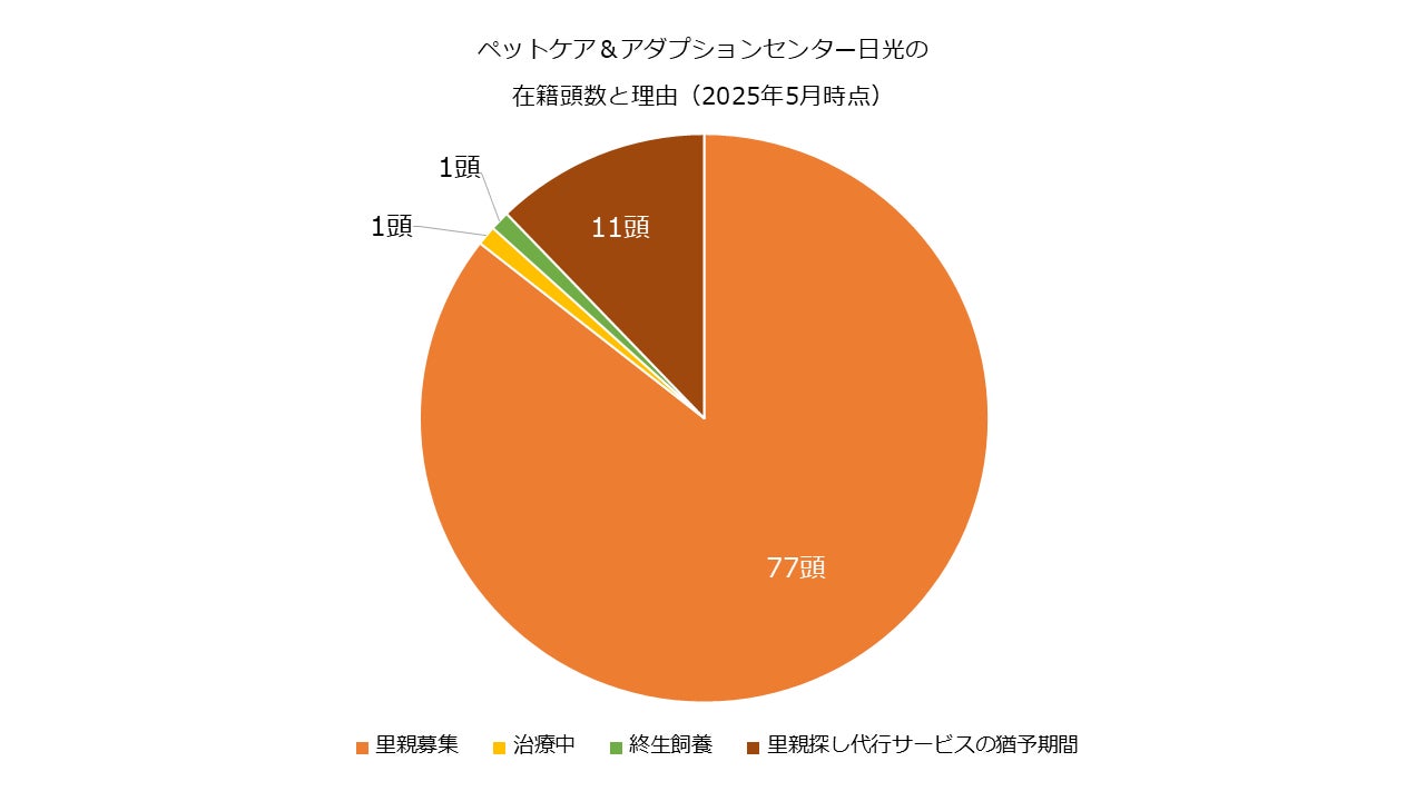 現在、ペットケア&アダプションセンター日光には2025年5月末時点で90頭が生活し、主に治療を終えた、または回復期にある77頭が⾥親を募集中です。なお、11頭は里親探し代行サービスの猶予期間中のため募集待ち、1頭は治療中、1頭は終生飼養を行う予定です。