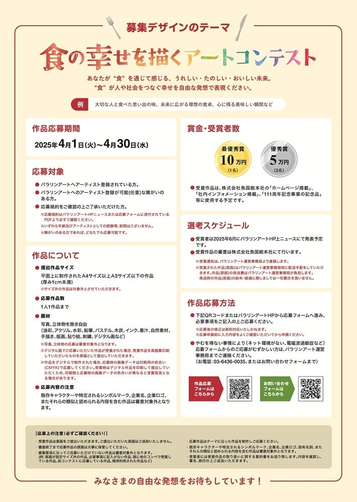 魚国総本社は〝食〟を通して関わる全ての方に、カラダとココロの健康を育みたい“食”を通じて社会に貢献できることを、お客様も従業員もともに喜び合えるような温かいHuman Companyでありたいと願っています。性別、年齢、国、文化、障がい等さまざまな違いも関係なくお互いを認め、尊重し、違いがあってもそれが「普通」であること。一人ひとりの個性を大切にし、「うれしい たのしい おいしい みらい」そして関わるすべての皆さまと「つなぐ つながる」の思いをテーマに表現する「食の幸せ」パラリンアートコンテストを開催いたします。皆さまからのたくさんのご応募を心よりお待ちしております!