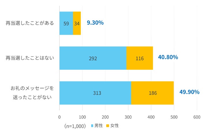 「お礼のメッセージを送ったことがない」と回答した人が49.9%で、半数近くがメッセージを送らないことが分かりました。「再当選したことはない」と答えた人は40.8%で、メッセージを送っても再当選に繋がらないという認識が広がっています。「再当選したことがある」と答えた人は9.3%と少数派です。この結果から、お礼のメッセージと再当選に関する関連性は薄いと感じている人が多いと推測されます。再当選の可能性が低いと認識されるため、メッセージを送るインセンティブが低いのでしょう。ただし、再当選した人も一定数いるため、こうした行動が次の懸賞当選に影響を与えていると考える人もいるようです。