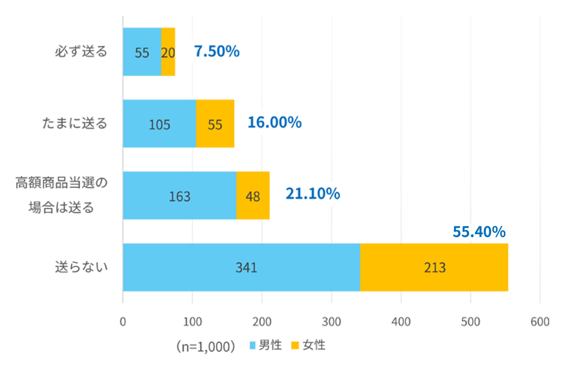 「お礼のメッセージを送らない」と回答した人が全体の55.4%と過半数を占めている一方で、「高額商品当選の場合は送る」と答えた人が21.1%、また「たまに送る」と回答した人が16%で、約4割の人が状況や条件に応じてお礼のメッセージを送ることがあることが分かります。一方、「必ず送る」と答えた人は7.5%と少数派でした。この結果から、感謝のメッセージが懸賞参加者の印象にどのような影響を与えるのかについて明確な情報が不足しているため、行動に踏み切れない人が多いのではないかと考えられます。