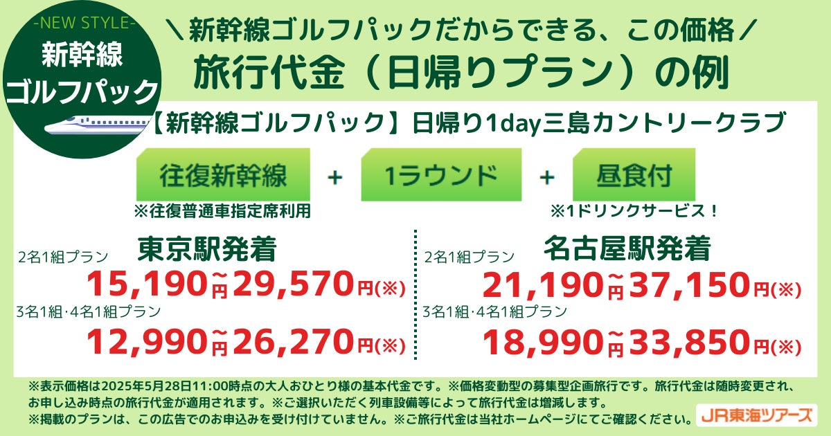 株式会社ジェイアール東海ツアーズ(本社:東京都中央区、以下JR東海ツアーズ)は、新企画のEX旅パック「新幹線ゴルフパック」を発売致しました。「往復新幹線+三島カントリークラブ1ラウンドプレイ+昼食+1ドリンク」がセットになった宿泊プランと日帰りプランが、気軽にゴルフをお楽しみいただけるようお得な価格で登場します。新幹線で行くから渋滞の心配は一切なし!運転があるからお酒が飲めない、そんな悩みも心配ご無用!帰りは静岡ご当地グルメを楽しみながら宴会などの新しい楽しみ方も。富士山と駿河湾の眺望が美しい三島カントリークラブで、感動のゴルフ体験をお楽しみください。