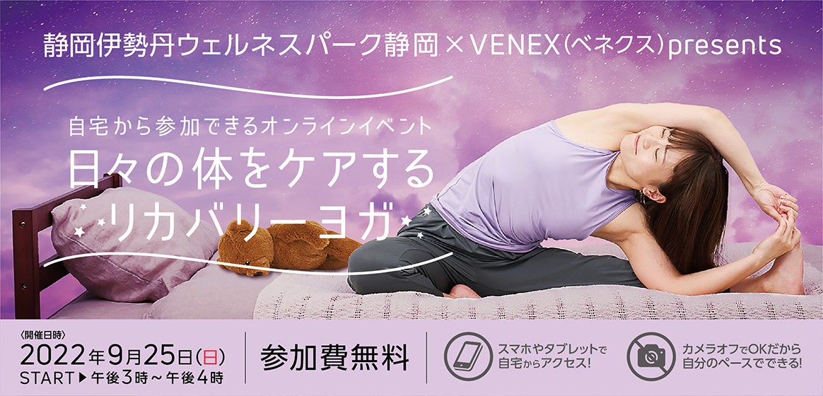 休養時専用の「リカバリーウェア」を開発、製造、販売する株式会社ベネクス(所在地:神奈川県厚木市、代表取締役:中村 太一、以下、当社)は、静岡伊勢丹が市と連携し7階に開業した健康関連の売り場を提供する「ウェルネスパーク静岡」とコラボし、無料オンラインイベント『静岡伊勢丹ウェルネスパーク静岡×VENEX presents 日々の体をケアするリカバリーヨガ』を2022年9月25日(日)15:00より開催します。