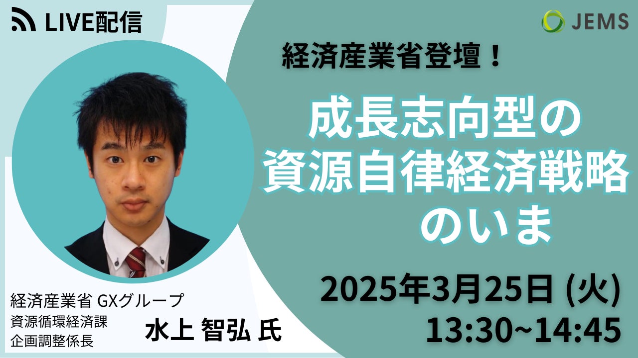 「静脈インフラをITで創造する」をパーパスに事業を展開する株式会社JEMS(本社:茨城県つくば市、代表取締役:須永裕毅、以下:JEMS)は、2025年3月25日に経済産業省の水上智弘氏を講師にお迎えし、「成長志向型の資源自律経済戦略」をテーマとした無料オンラインセミナーを開催いたします。