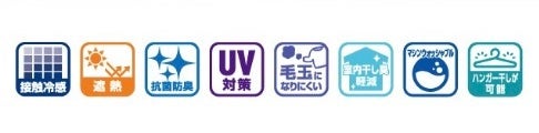 接触冷感、遮熱機能、抗菌防臭、UV対策、毛玉になりにくい、室内干し臭軽減、マシンウォッシャブルの7つの機能に加え、今年はハンガー干しもできるようになりました。