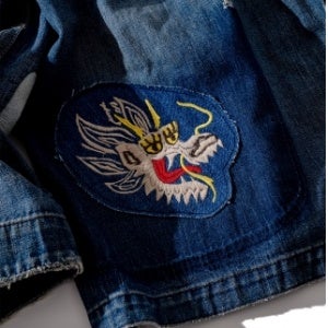 フロント下部のポケットには、長年の使用で外れたような加工を施し、龍のワッペンをオン。