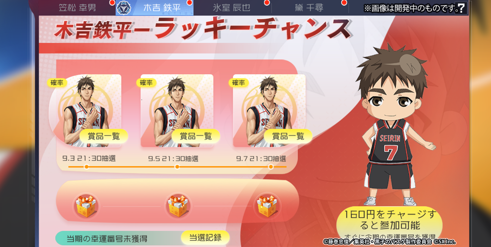 ▶幸運値が200に達した際に、まだ選手「木吉鉄平」を獲得していない場合、次の抽選で必ず「木吉鉄平」を入手できます。