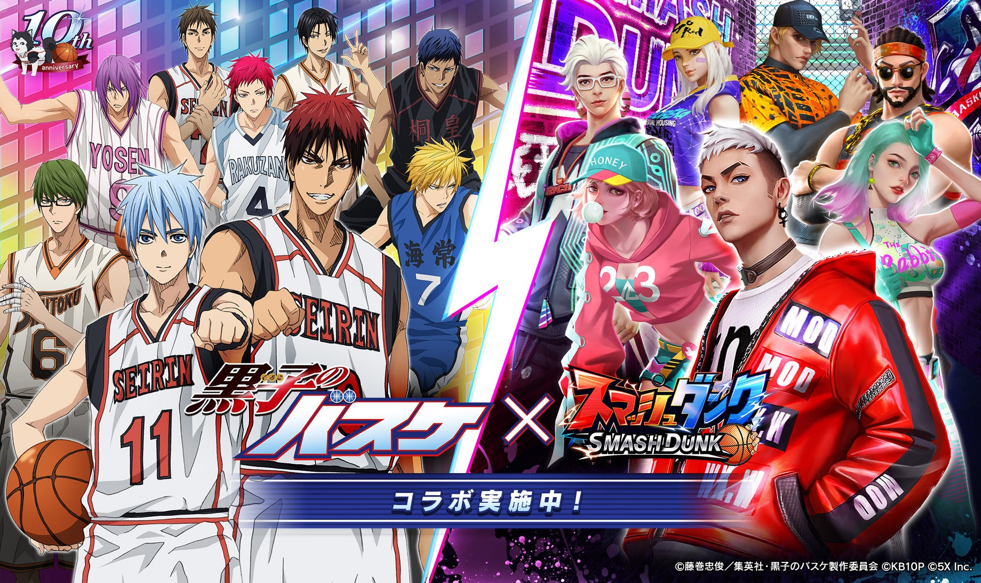 株式会社ファイブクロスから配信中のリアルなストリートバスケを体感できるスマホ向け対戦型ゲーム「スマッシュダンク」は、2022年10月18日(火)より、人気アニメ『黒子のバスケ』とアニメ10周年記念としてコラボイベントを開催いたします。