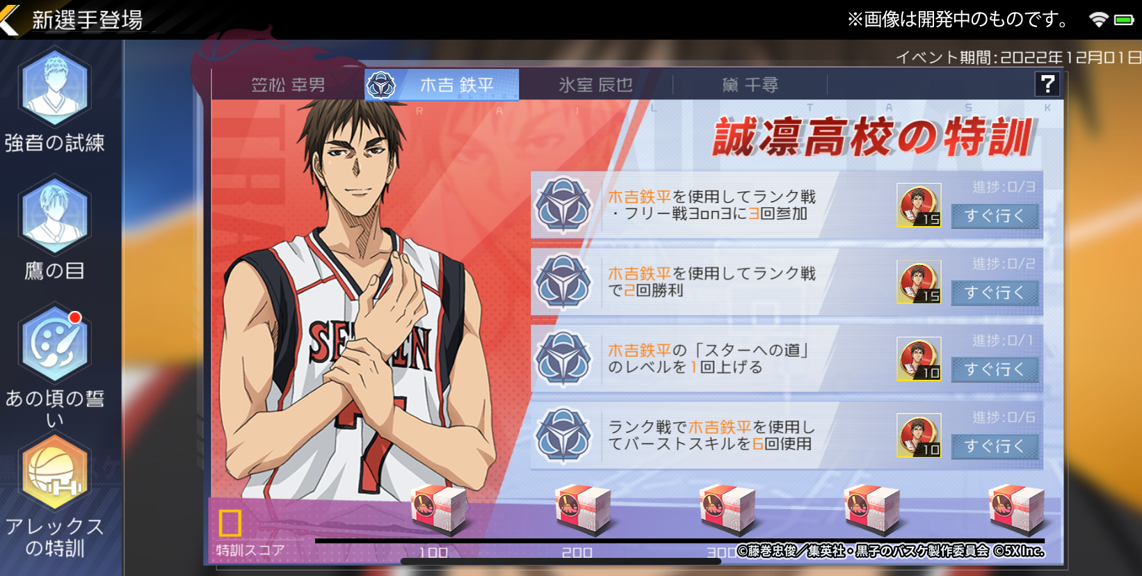コラボ期間中、選手「木吉鉄平」を所有していると、木吉の専用特訓任務「誠凛高校の特訓」を開放できます。