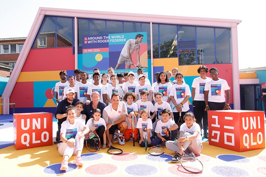 ユニクロは、5月22日(水)に、グローバルブランドアンバサダーのロジャー・フェデラー氏と共に世界を巡る次世代育成プロジェクト「Around the World with Roger Federer」の第3弾をパリ郊外のラ・クールヌーヴで開催しました。当日は、フェデラー氏による特別テニスクリニックが行われ、地元のジュニア選手たちが参加しました。本イベントは、ソーシャルパートナーであるフェット・ル・ムールの協力のもと、パリのアーティスト、カロリーヌ・デルヴォー氏が手掛けた鮮やかなアートワークが施されたテニスコートで開催されました。