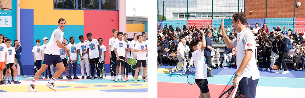 イベントが開催されたラ・クールヌーヴは、若く、エネルギッシュで、多様性に富み、大きな変貌を遂げつつある地域です。世界のさまざまな都市で開催しているAround the World with Roger Federerでは地域社会への貢献にも力を入れており、今回は、開催地となったラ・クールヌーヴへ、ユニークなアートワークが施されたテニスコートを寄贈しました。このコートは、ラ・クールヌーヴの人々に開放され、コミュニティの施設として利用できます。