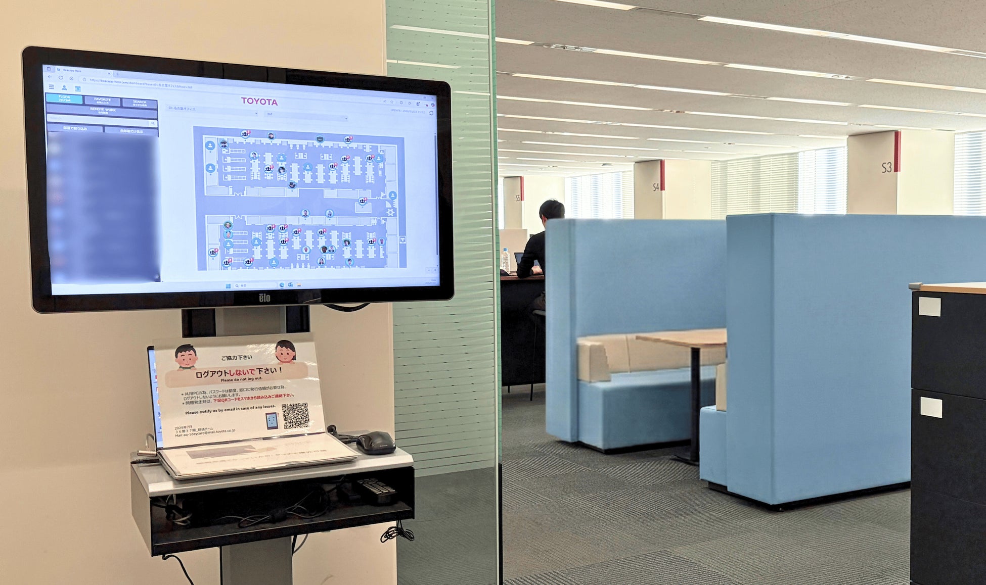 トヨタ自動車では、出社とリモートワークが混在する働き方に加え、部署を越えて自由に席を選べるフリーアドレスの導入により、「相手が出社しているのか分からない」「どこに行けば会えるのか判断できない」といった状況が日常的に生じていました。また、従来は社員自身が居場所を入力する仕組みで管理していたものの、入力漏れや一時的な離席が反映されないなど、実際の状況との乖離が課題となっていました。