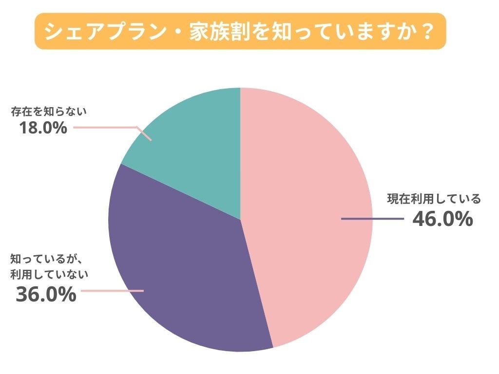 スマホのシェアプラン・家族割について、「現在利用している」という方が最も多い46%という結果になりました。