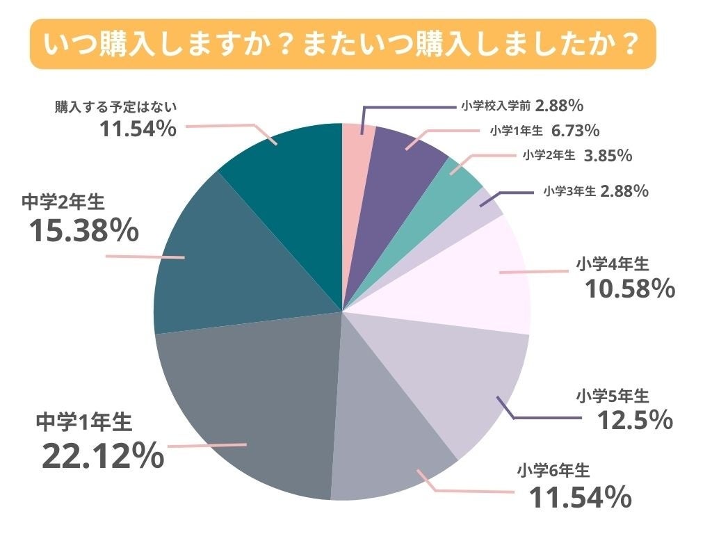 お子様の携帯・スマホをいつ購入するか、またいつ購入したかの質問では、「中学1年生」と回答した方が22.12%と最も多く、次いで「中学2年生」「小学5年生」という結果になりました。