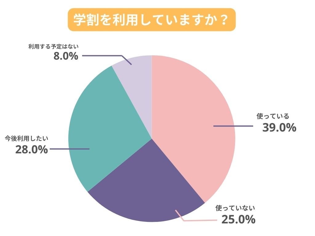 スマホの学割について、「使っている」と回答した方が39%と最も多く、「今後利用したい」と回答した方が28%という結果となりました。