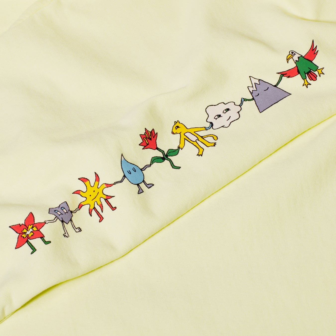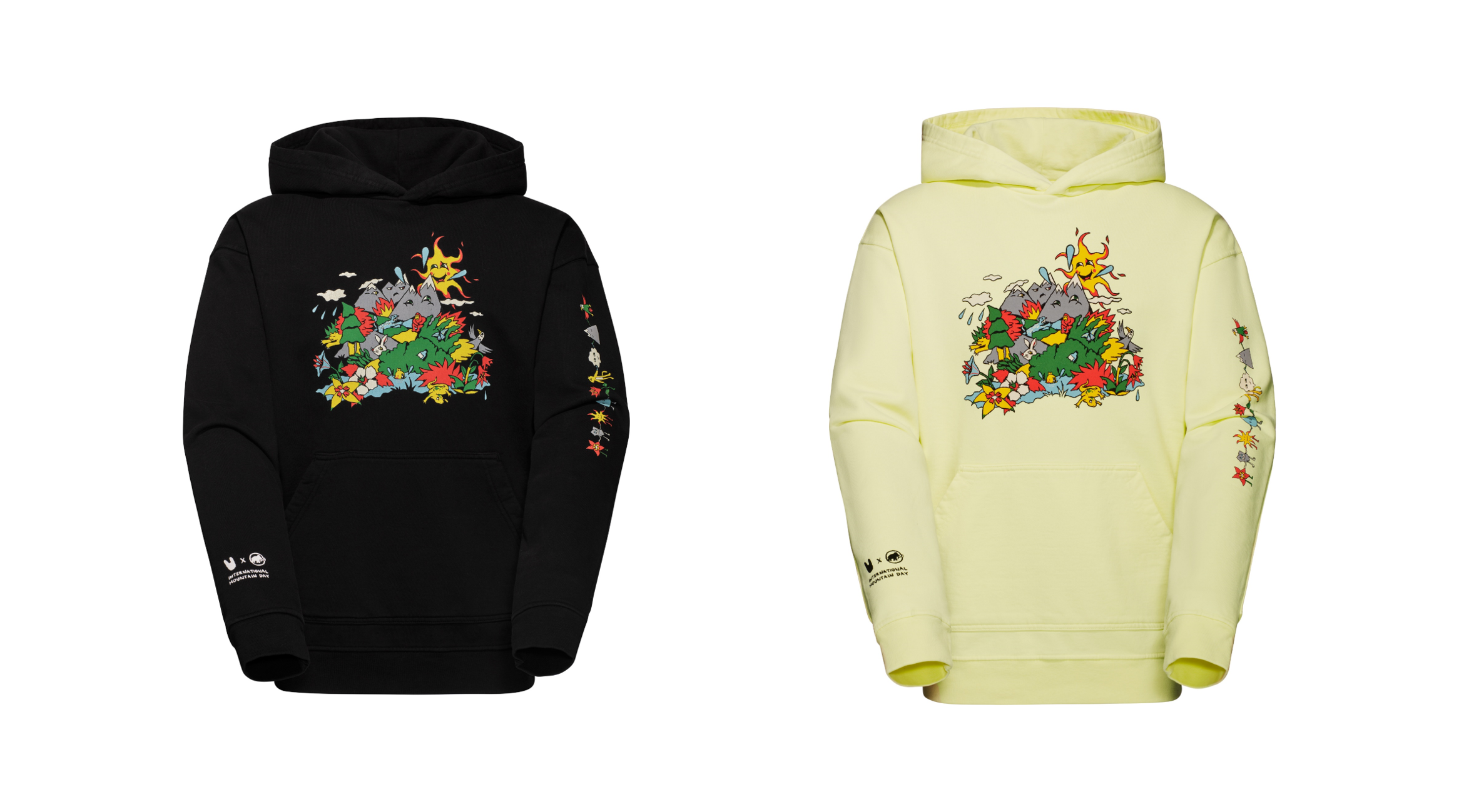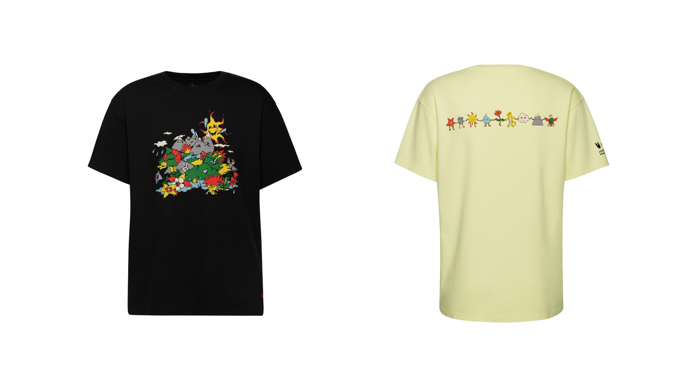 山には、動植物、言語、文化などの豊かな生物の多様性があります。山は、私たちすべての故郷であり、私たちはその保護に情熱を注いでいます。Tシャツの背中とパーカーの袖には、イラストの要素(動物、山、植物、太陽)が手をつないでいます。このイラストでは、絶滅の危機に瀕している山の植物や動物たちが、最初は幸福感や無邪気さを感じさせる陽気な色彩のデザインで描かれています。しかし、よく見ると、一見のどかな風景は、山々が太陽の下で汗を流している風景であり、茂みの中に捨てられたゴミのような微妙なディテールは、人類が自然に与える影響についての意識喚起となっています。