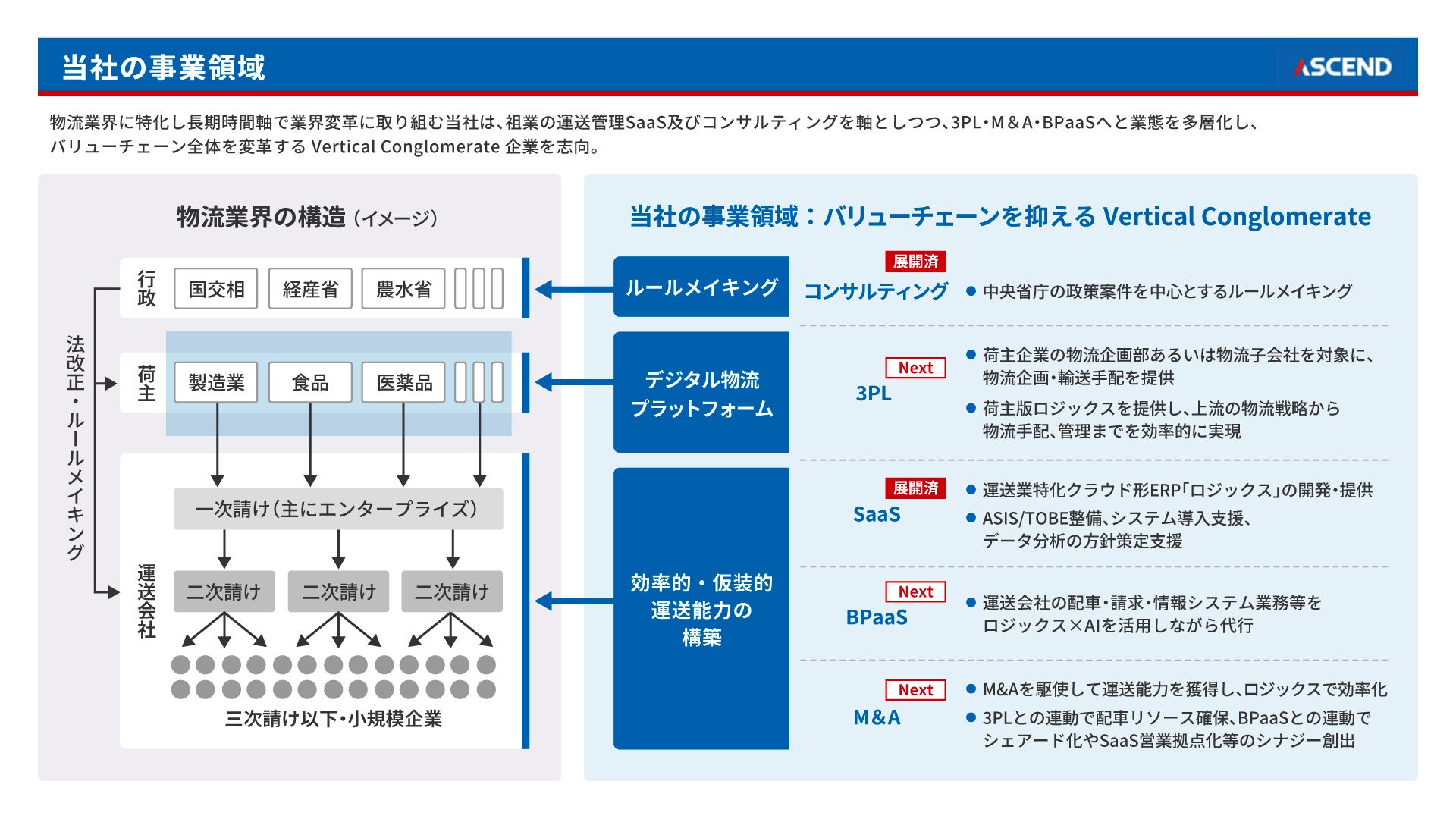 更に、今後はSaaSだけでなく運送業界に対する緻密で包括的な“Vertical Conglomerate 戦略”を以って根本的な業界変革に取り組もうとしています。“物流構造の再設計”という壮大な挑戦に向き合うアセンドを、弊社も全力でご支援させていただきます。