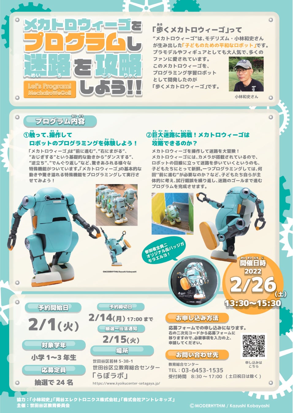 株式会社SpeedLinkJapanの子会社である株式会社アントレキッズ(本社:東京都渋⾕区、代表取締役⻄⽥祥)は、今回世田谷区立教育総合センター「らぼラボ」にて2月26日(土)に小学低学年向けのプログラミング体験授業を開講いたしました。プロモデラー・CG作家の小林和史さんによるオリジナルロボット”メカトロウィーゴ”をプログラミングして体感するイベントとなりました。