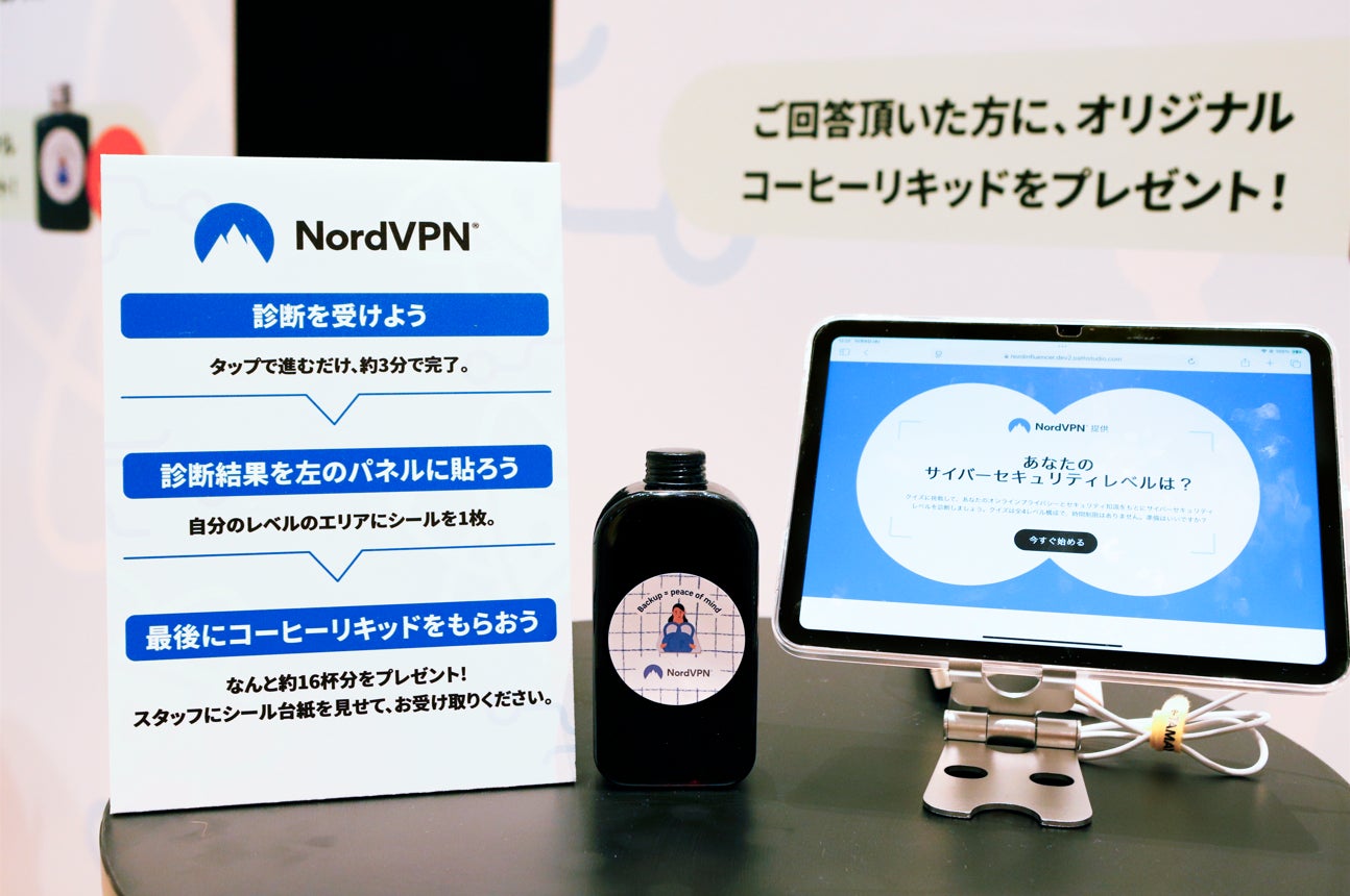 会場ではクイズ形式で自分のセキュリティレベルをチェックできる体験型コンテンツ「セキュリティリスク診断テスト」や、来場者全体の結果を可視化する集計ボードを設置。さらに、NordVPNの独自調査データをもとに作成した大型パネルを展示し、日常に潜むリスクを分かりやすく紹介しました。また、日常に戻ってからも自然にセキュリティを意識するきっかけとなるよう、セキュリティTipsを記載したコーヒーリキッドを配布しました。