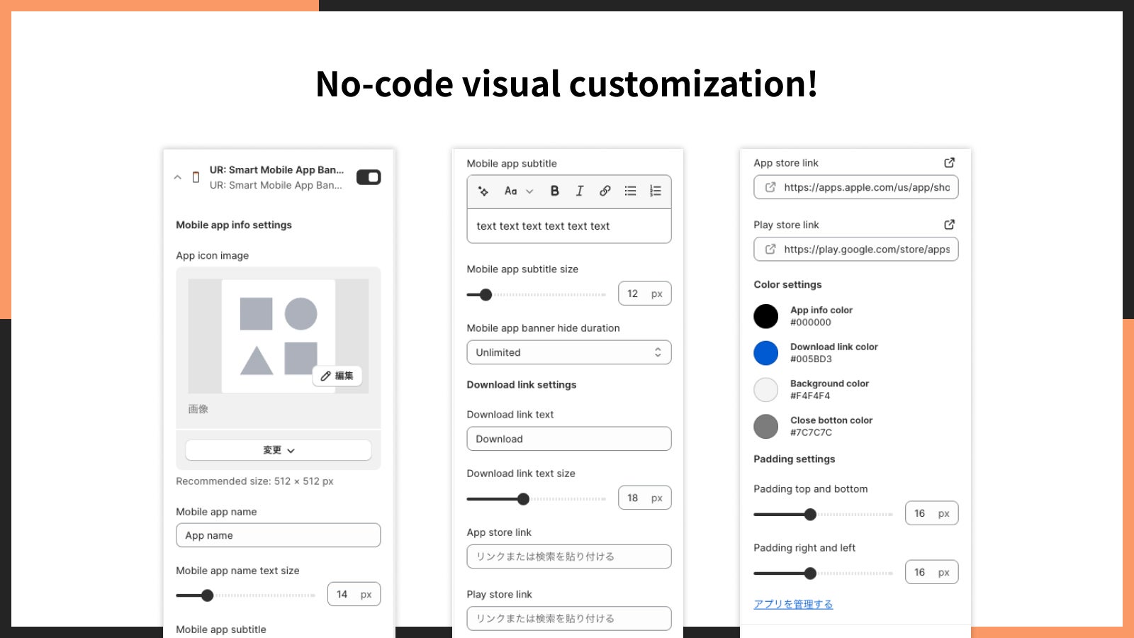 「UR: Smart Mobile App Banner」は、ノーコードで見た目をカスタマイズできます。テキストや色など様々なカスタマイズができるため、実現したいストアに合わせたデザインを簡単に実現できます。