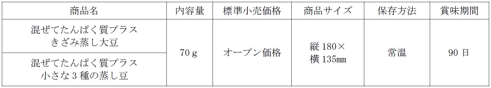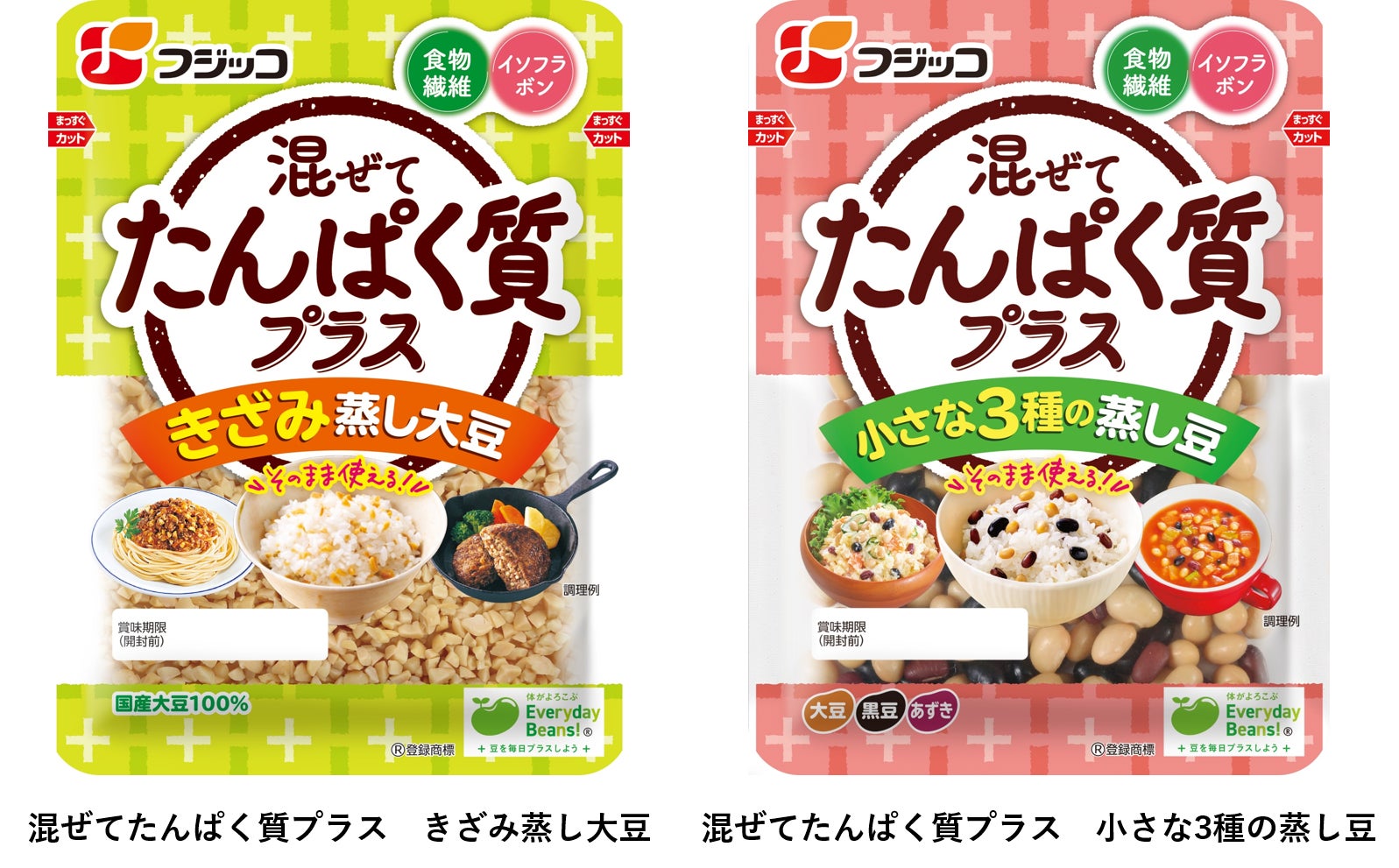 今回リニューアルした「混ぜてたんぱく質プラス きざみ蒸し大豆」「混ぜてたんぱく質プラス 小さな3種の蒸し豆」は、普段の食事に混ぜるだけで、たんぱく質や食物繊維、イソフラボンなどを手軽に摂ることができます。本商品でお客様の食生活の向上やお悩みの解決を図ってまいります。