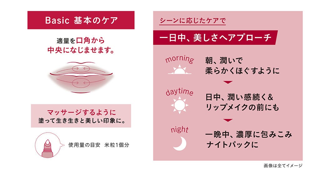 日中のリップメイクの前のケアにも、夜に塗って翌朝まで潤いを保つナイトパックとしてもおすすめでき、シーンに応じた唇ケアができます。
