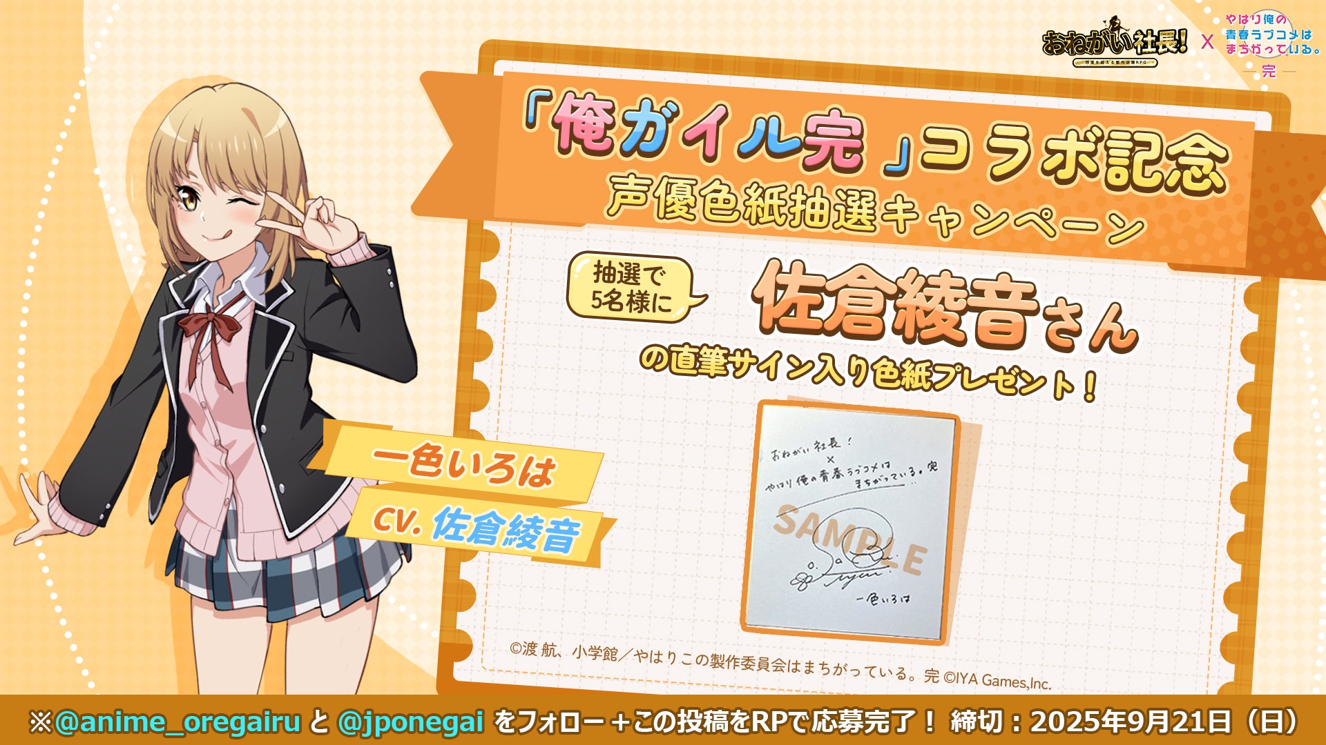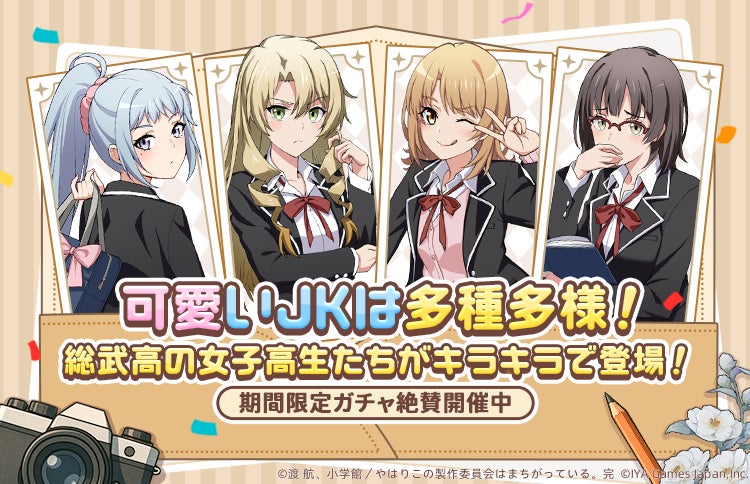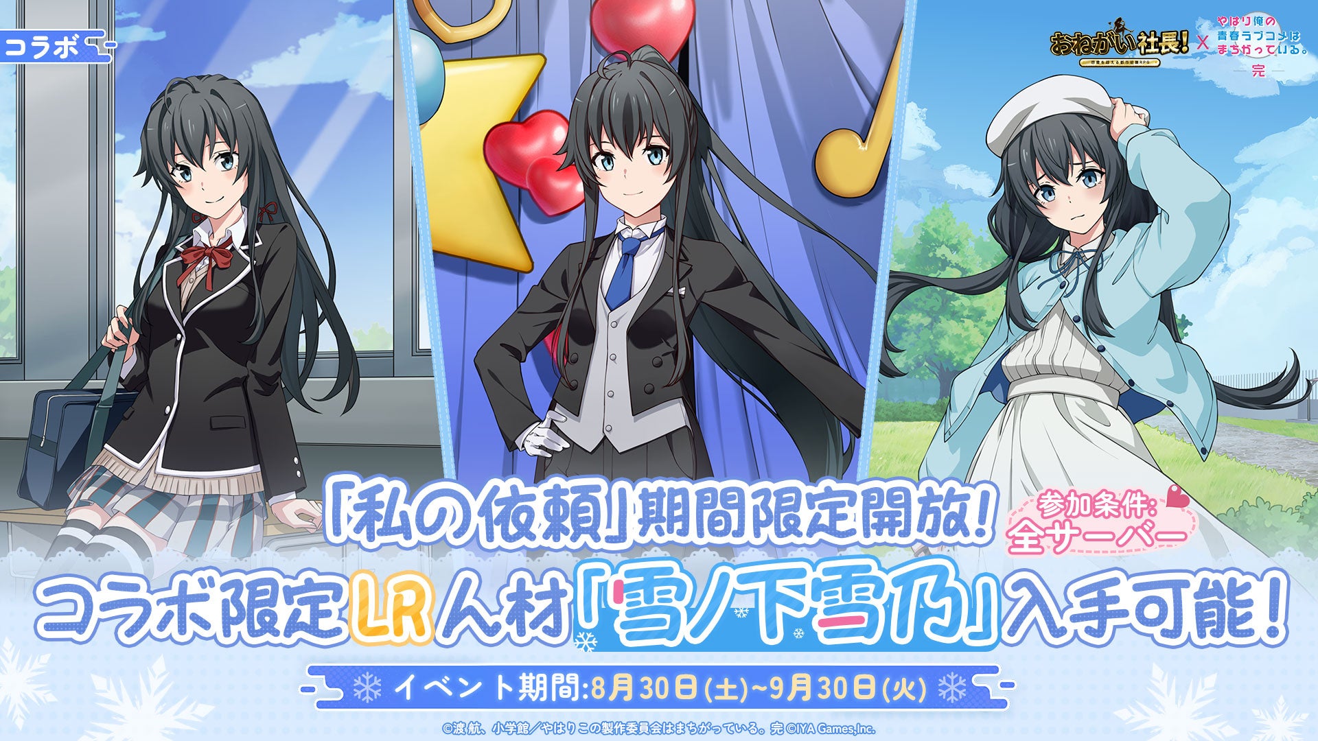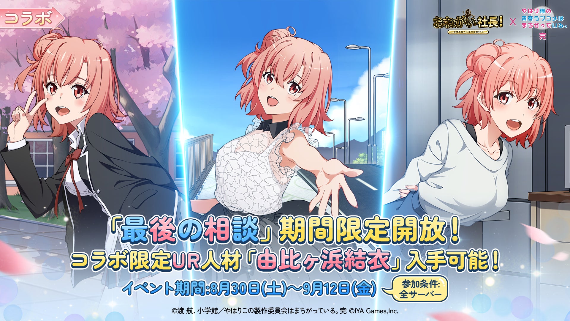 IYAGAMESは、スマホ向け人気会社経営シミュレーションゲーム『おねがい社長!』において、TVアニメ『やはり俺の青春ラブコメはまちがっている。完』(以下、『俺ガイル』)とのコラボを2025年8月30日(土)より開催します。