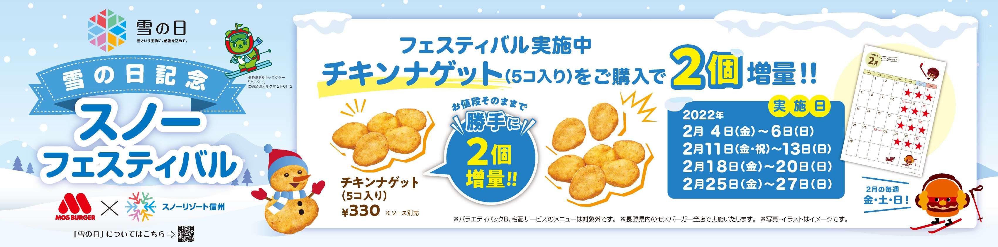 県内のモスバーガー店舗では、日頃のご愛顧を感謝して、子どもの頃より“雪”に親しんでいる県民の方々へ『雪の日』に合わせ、2022年2月4日(金)~27日(日)の間、毎週金、土、日に、「チキンナゲット(5コ入り)」をご購入いただいた方(モスワイワイセット含む)を対象に、同商品の価格をそのままに2コ増量して提供します。『雪の日』に合わせた企画を開催するのは、昨年に引き続き、今年で2回目となります。“雪”がくれるわくわく感と同様に「チキンナゲット」が2コ増量になる、わくわくうれしい気持ちをモスの店舗でも感じてください。
