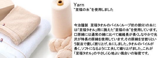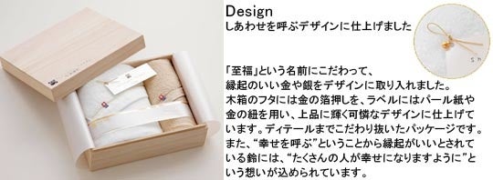 至福タオルは繊維長が長く、しなやかな原綿を厳選。甘撚りの糸で柔らかな風合いが特長だ。タオル産地の愛媛県今治市で生産している。木箱入りは売り場でも高級感のあるギフトとして人気だ。箱は金の箔(はく)押し、ラベルはパール紙や金のひもで装飾した。上質なタオルの価値を気づかせる商品だ。