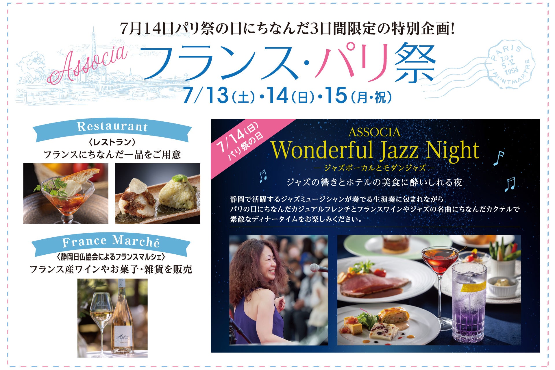 7月14日はパリ祭の日(フランスの建国記念日)。ホテルアソシア静岡(静岡市葵区・総支配人 坂口修成)では、7月13日(土)・14日(日)・15日(月・祝)の3日間「フランス・パリ祭」と題し、レストランにてフランスにちなんだ料理の提供や、ご宿泊者様限定でフランスの海洋成分をベースとしたアメニティのプレゼントを実施。7月14日パリ祭の日当日は、宴会場にて「ASSOCIA Wonderful Jazz Night」と、ホテル正面玄関にて静岡日仏協会によるフランスマルシェを開催します。