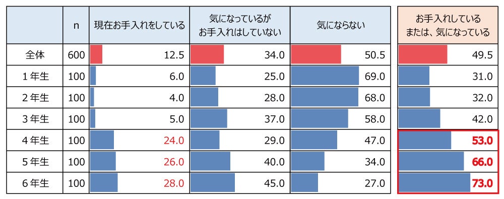 今年の調査によると、小学4年生では「現在お手入れしている」または「気になっている」と回答した方が53.0%と半数を超えました。高学年になるにつれてさらに増えていく傾向がありました。「現在お手入れをしている」で見ると、小学3年生までは4.0~6.0%だったのが、小学4年生以降は20%台に急増しています。