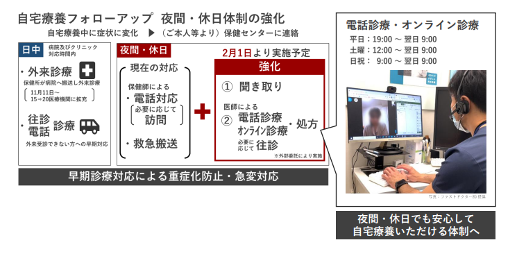 これにより、自宅療養中の夜間・休日に症状の変化があった場合は、保健センターに連絡いただければ、必要に応じて医師による電話診療、オンライン診療、症状によっては往診を受けることが可能になります。