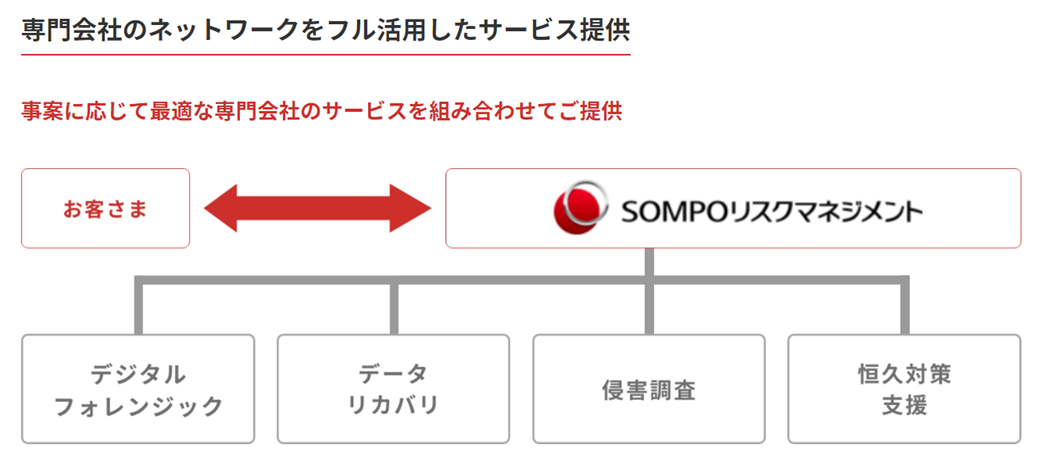 (5)内 容 : サイバーインシデントの発生またはそのおそれを覚知した場合のご相談窓口として、お問い合わせを受け付けます。ご相談の内容や状況に応じて、SOMPOグループの持つ豊富な事故対応の経験やリスクマネジメントの知見・ノウハウに基づき、お客さまのサイバーインシデントの初期対応をご支援します。また、初期対応支援に基づく、後続サービスについても、ご提案します。