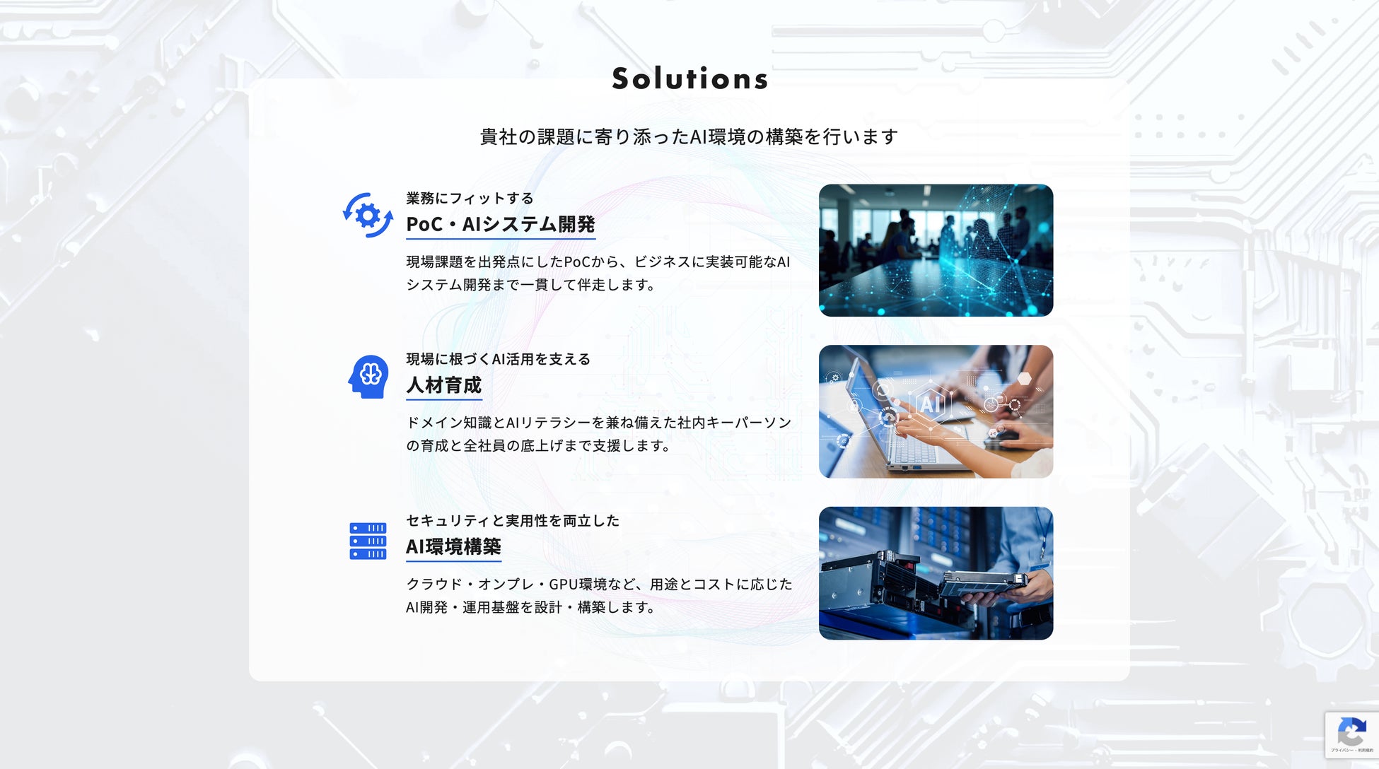 「PoCで終わらないAI実装」をテーマに、AI開発・GPUインフラ構築・人材育成を一体的に支援し、現場で運用され続けるAIの仕組みづくりを伴走型で推進しています。