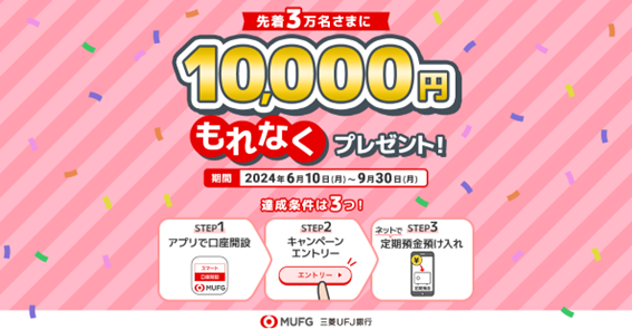 【三菱UFJ銀行】アプリで口座開設&定期預金預入で、先着3万名さまへ現金10,000円を還元!