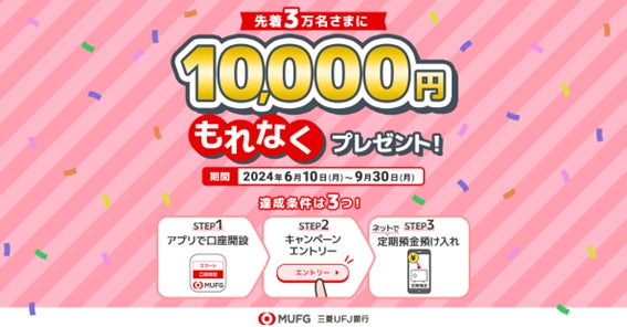 株式会社三菱UFJ銀行(以下 当行)は、アプリで口座開設し、インターネットバンキングで定期預金を10万円以上預入したお客さまを対象に、総額3億円の現金還元キャンペーンを6月10日より開始します(先着3万名さまに10,000円の還元)。このキャンペーンは、資産形成に対するお客さまの関心が高まる中、マイナス金利政策の終了に伴う定期預金へのニーズにお応えするためのものです。当行はお客さまのライフステージに合わせた資産形成をサポートしていきます。