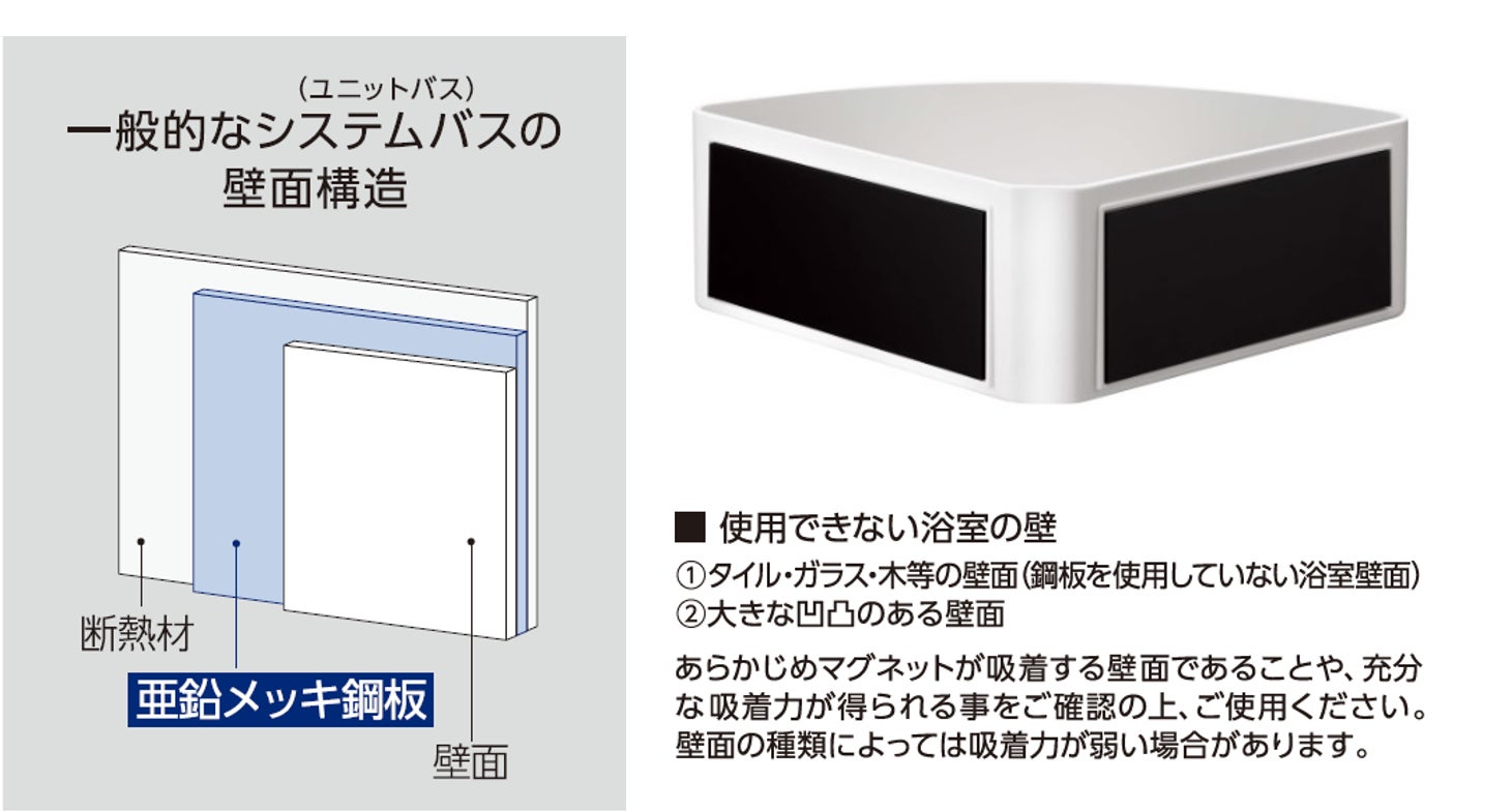 一般的なシステムバス(ユニットバス)には亜鉛メッキ鋼板が使用されているため、磁石を取り付けることができます。吸盤タイプのように落下の心配がいらず、位置調整も簡単。浴室の収納におすすめです。