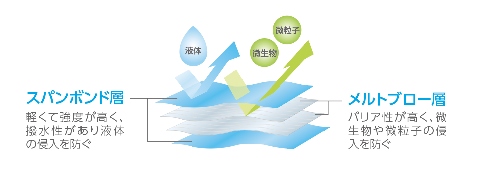 強度と撥水性に優れたスパンボンド層(S)を外側、微生物や微粒子に対するバリア性が高く柔軟性を有するメルトブロー層(M)を内側に配したSMMS 4層構造で、強度と柔軟性、そしてバリア性を有しています。