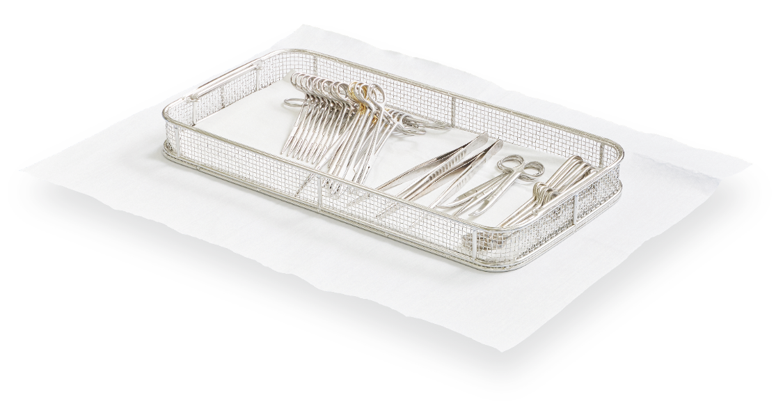 「セーフシール トレイライナー(吸水乾燥シート)」は、滅菌時に発生する水分を素早く吸収分散し、乾燥を促進します。また、底面に敷くことでバスケットの架台による包装材料の破損を抑制し、確実な滅菌をサポートします。