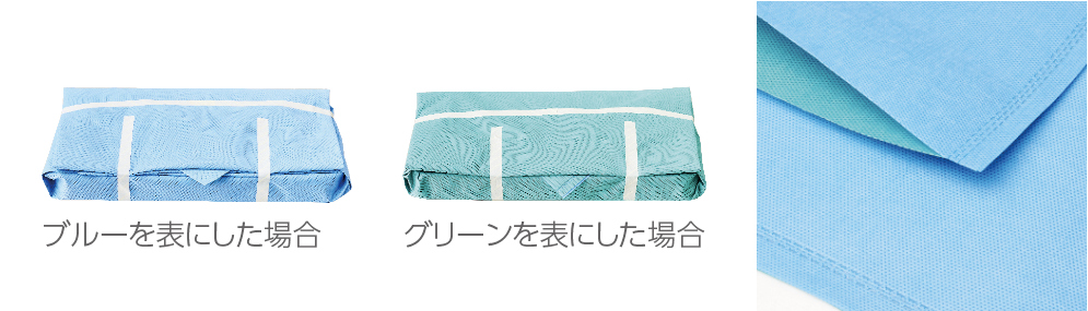 ブルーとグリーンの色違いのラップを超音波で圧着し重ねているため、破れや穴あきが発生しても見落としにくい利点があります。また、2色であることを生かして、貸出用医療機器と病院の医療機器との区別など、用途別に使い分けすることも可能です。