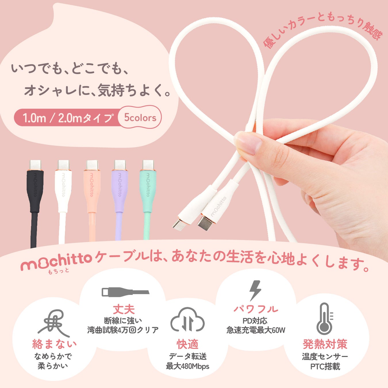 mochitto シリーズは「いつでも、どこでも、オシャレに、気持ちよく。」がコンセプトのシリーズ。第1弾はandroidスマホ、iPad、ノートPC等に使える両端タイプC急速充電ケーブルです。