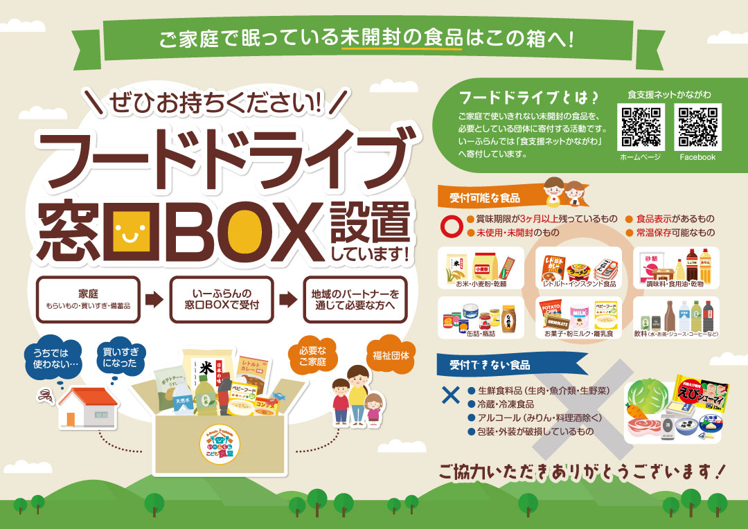 2024年4月1日(月)より、食品ロスの削減など、社会課題解決に向けたSDGsの取り組みの一貫として「食支援ネットかながわ」と共同し、「フードドライブ」の受付を開始しましたことをお知らせいたします。