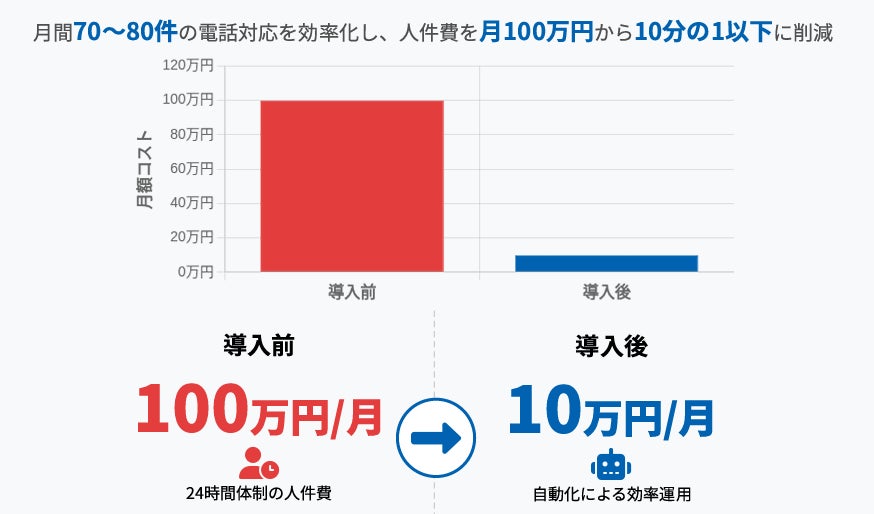 導入後は、人件費を月100万円から10万円に抑え、緊急対応の質を維持したまま業務効率化を実現しました。