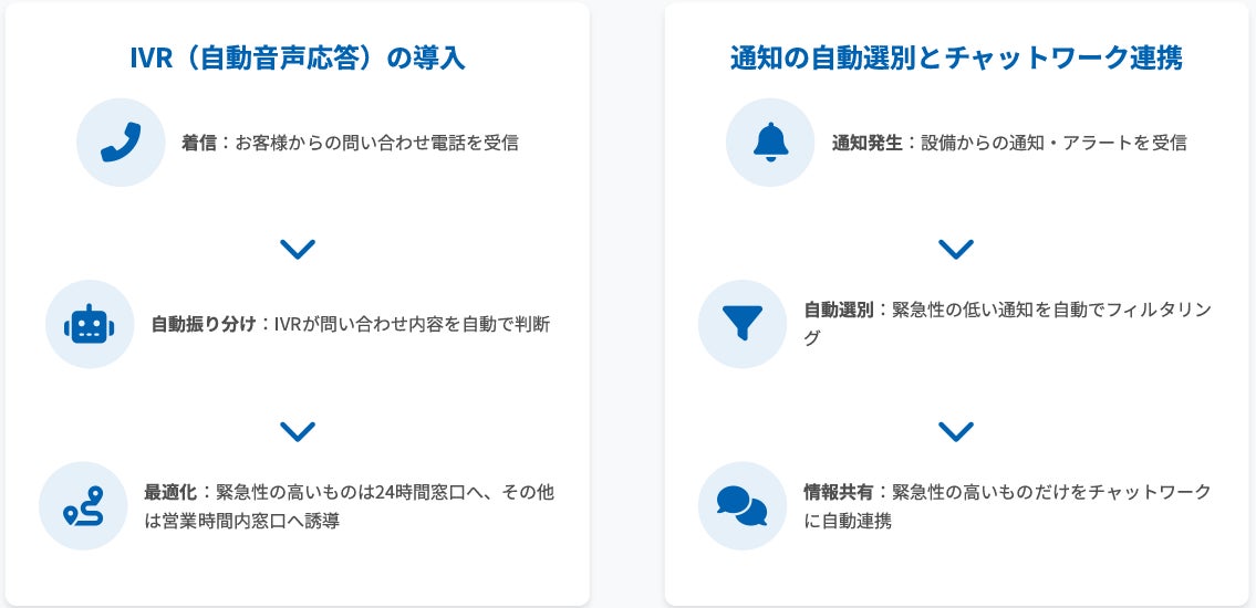 着信時に内容を自動で判別し、緊急案件は24時間体制の窓口へ、非緊急案件は営業時間内窓口へ振り分け。不要な電話を大幅に削減し、担当者が緊急対応に集中できる環境を整備。