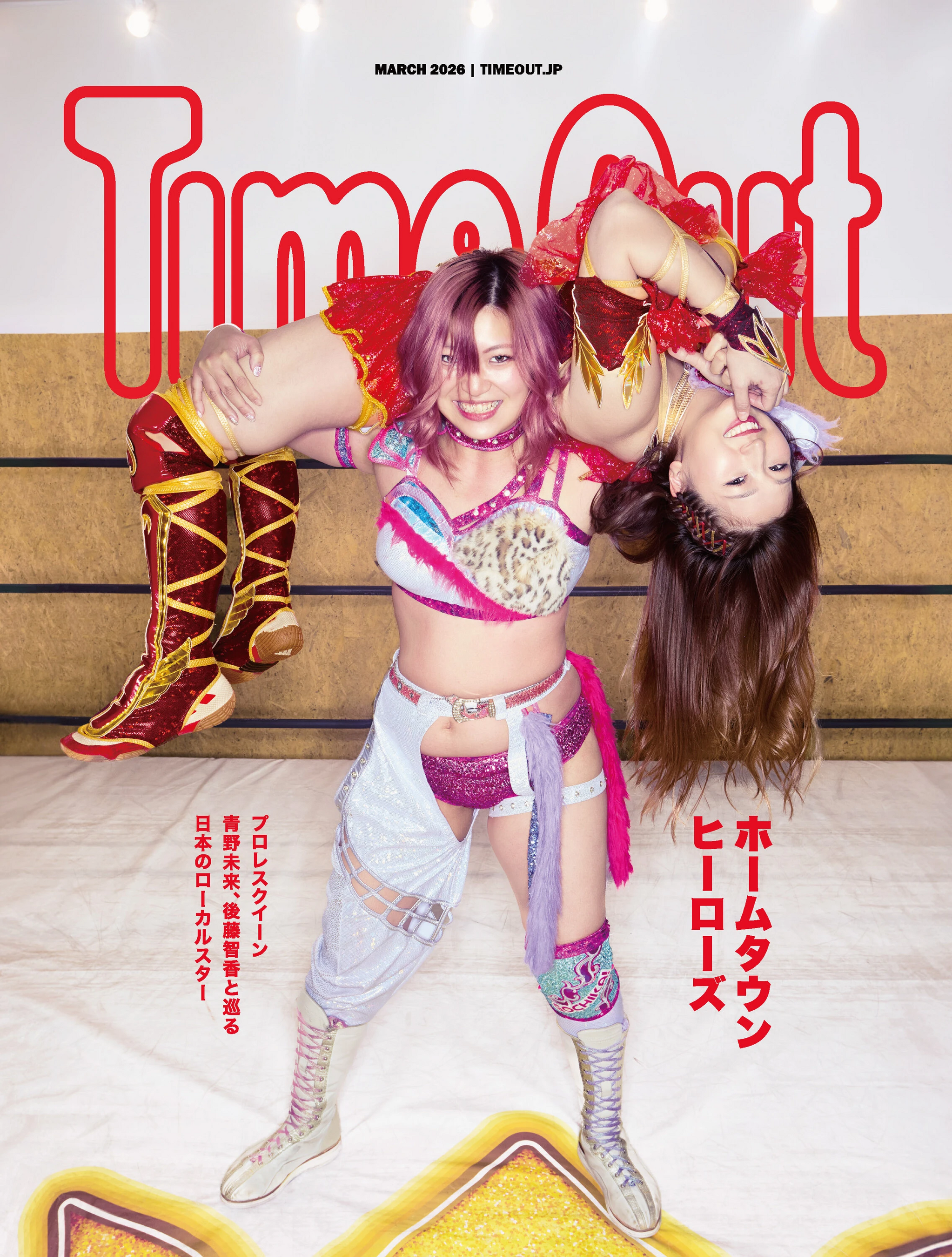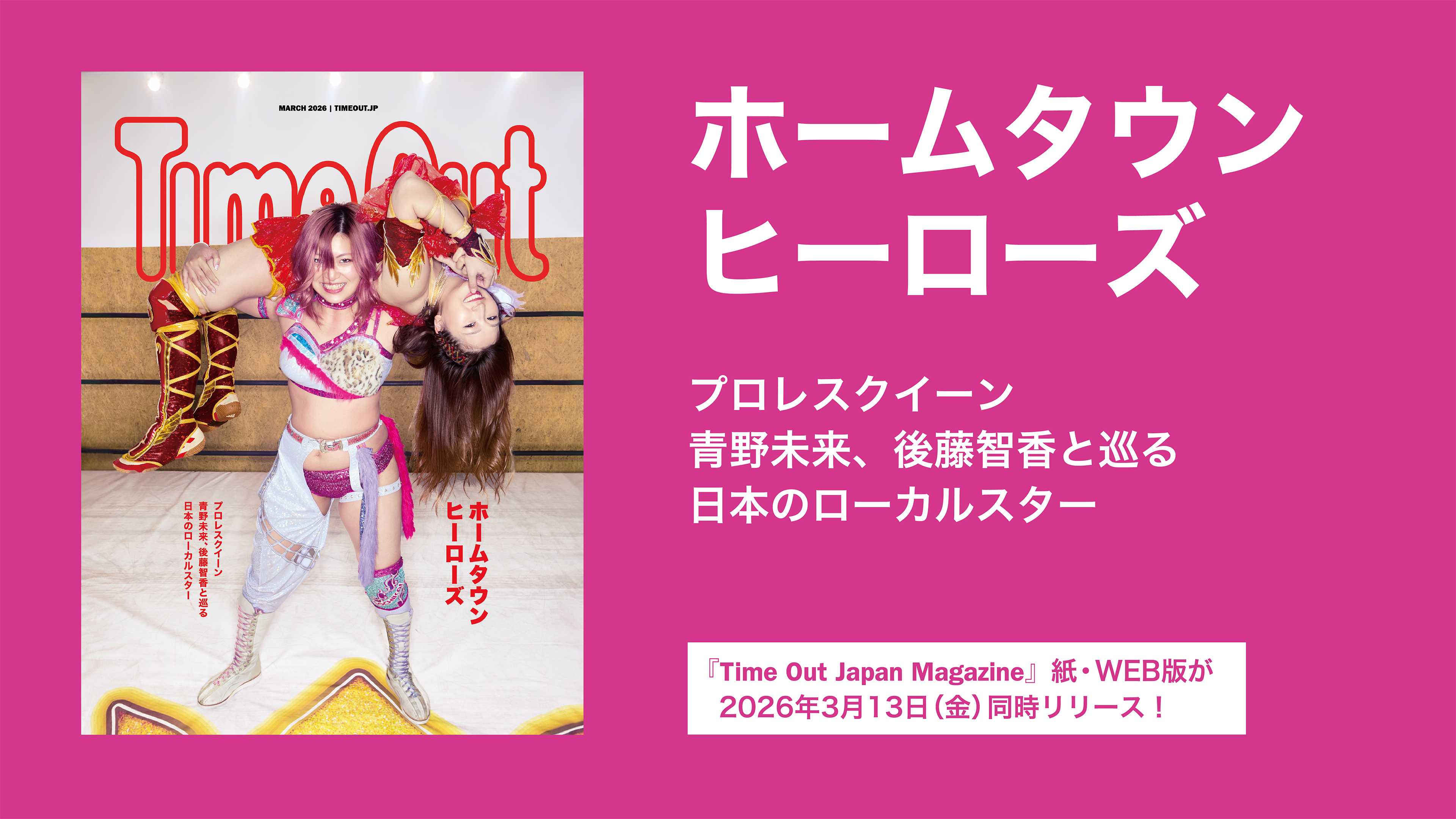 旅と日常をつなぐ新しいライフスタイルを提案するライフスタイルマガジン『Time Out Japan Magazine』の第3号が、2026年3月13日(金)に発行します。今号は「ホームタウンヒーローズ」をテーマに、地元に根ざしながら個性輝く人や店を特集。表紙には女子プロレス団体「マリーゴールド」のチャンピオン青野未来と後藤智香が登場します。日本語・英語の2言語で計6万部発行し、全国主要都市の商業施設・空港・ホテル・タイムアウトマーケット大阪などで無料配布を開始します。