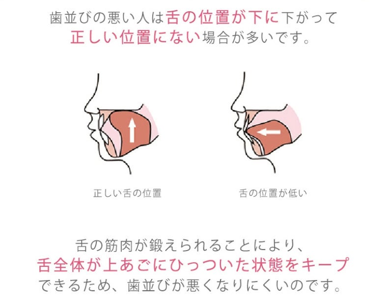 舌の筋肉が鍛えられることにより、舌全体が上顎にひっついた状態をキープできるため、歯並びが悪くなりにくくなります。