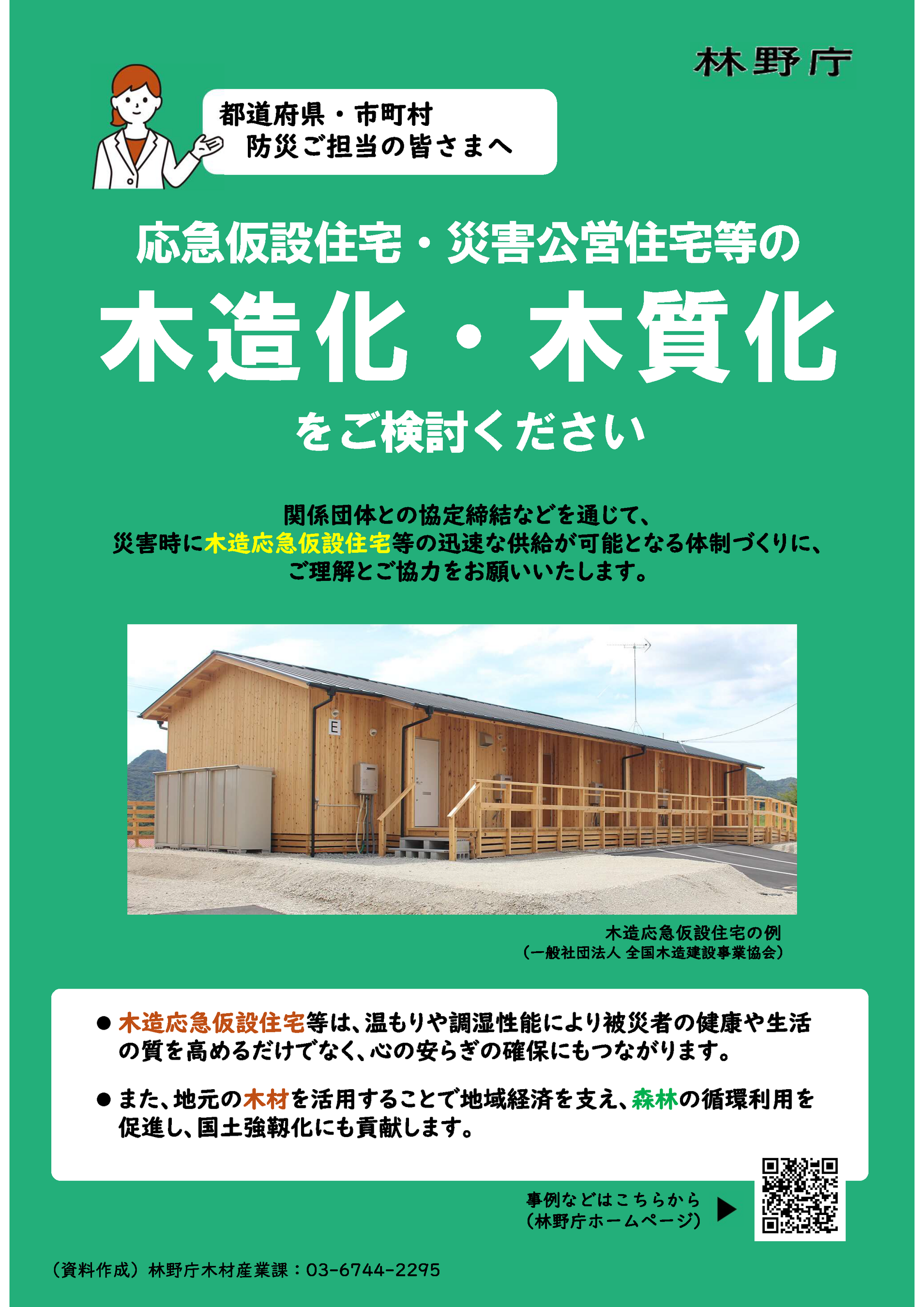 林野庁では、災害時における被災者の健康維持や心の安らぎ、地域経済の活性化を目的として、応急仮設住宅等の木造化・木質化を推進しています。